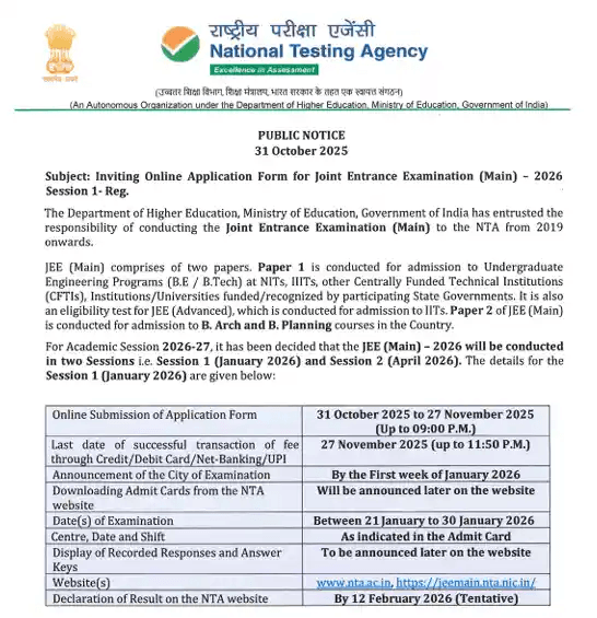 Short Information: JEE Main 2026: यदि आपने कक्षा 12वीं पास कर ली है और आप IIT, NIT जैसे प्रतिष्ठित इंजीनियरिंग कॉलेजों में प्रवेश लेना चाहते हैं, तो आपके लिए एक बड़ी खुशखबरी है। नेशनल टेस्टिंग एजेंसी (NTA) ने Joint Entrance Examination (JEE) Main 2026 के लिए आधिकारिक अधिसूचना जारी कर दी है। इच्छुक उम्मीदवार 31 अक्टूबर 2025 से 07 नवंबर 2025 तक ऑनलाइन आवेदन कर सकते हैं। इस लेख में हमने JEE Main 2026 Registration, आवेदन प्रक्रिया, आवश्यक दस्तावेज, पात्रता मानदंड, आवेदन शुल्क, परीक्षा पैटर्न और महत्वपूर्ण तिथियों की संपूर्ण जानकारी साझा की है ताकि आप आसानी से आवेदन कर सकें और अपनी परीक्षा की तैयारी शुरू कर सकें।